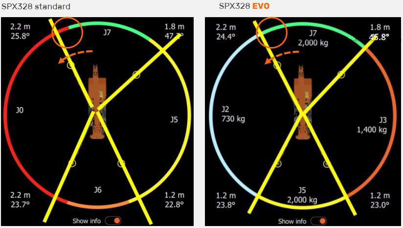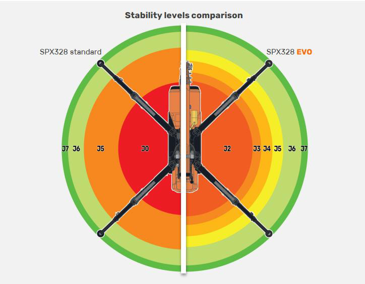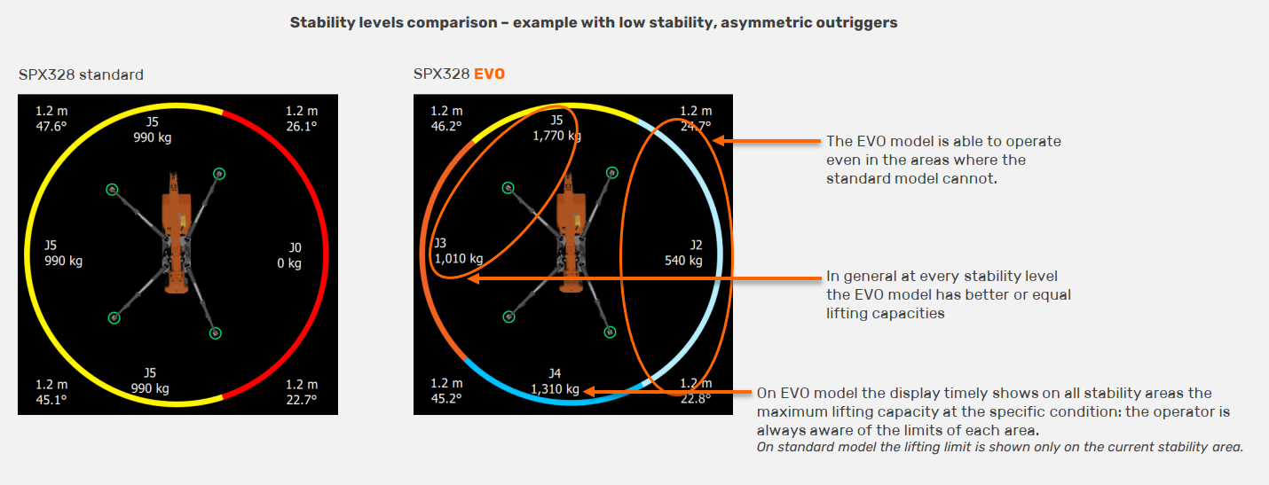 With EVO Option the early changes of stability areas have been eliminated: stability area can be fully usable up to the outriggers’ limits.