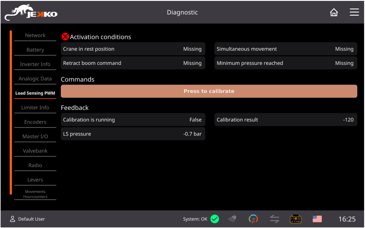 With this function, it is possible to calibrate the P-LS pressure directly on the crane.