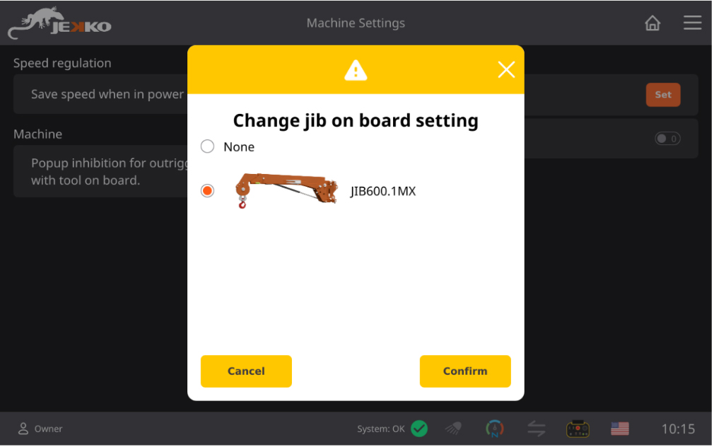 The operator can only confirm whether the JIB is on board on the crane or not but can’t change the type of JIB on board.