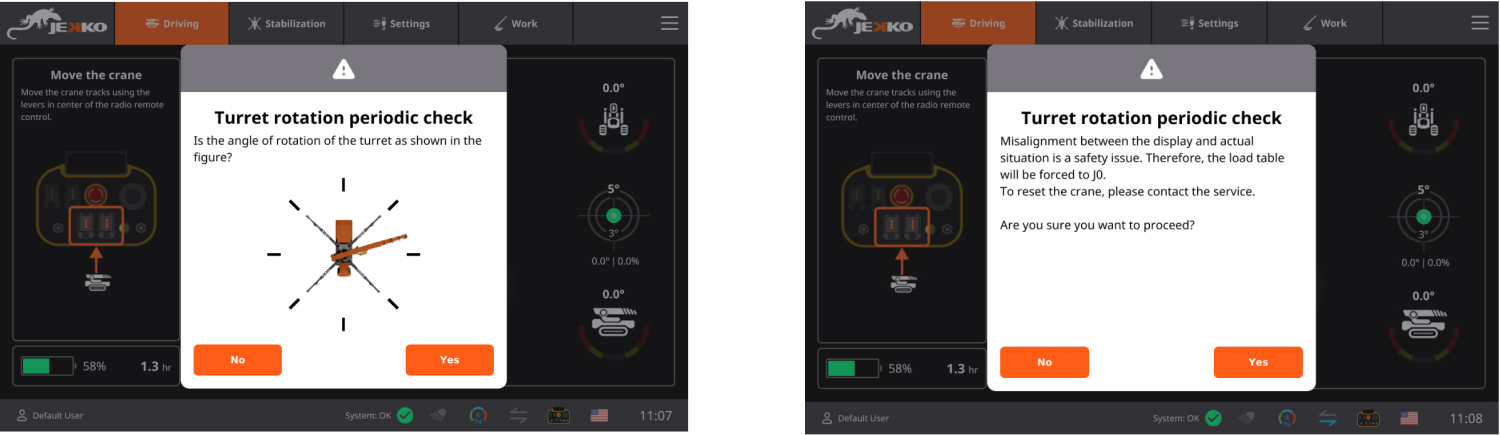 The operator must check the correspondence between the display and the real crane position: press “Yes” is it’s correct and keep working.